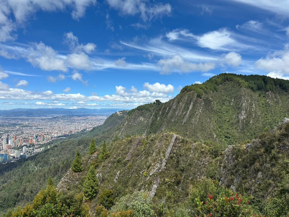 “A medida que se avanza, la pendiente aumenta y el camino se vuelve más estrecho. Bajo los pies aparecen raíces expuestas y fragmentos de lajas que revelan la estructura rocosa de la montaña. En algunos tramos el sendero pasa directamente sobre superficies de roca inclinada que obligan a caminar con cuidado mientras la ciudad comienza a aparecer a lo lejos”, señala el doctor Camilo Escallón Herkrath, biólogo investigador y líder de Patrimonio Natural del IDPC, explicado que más arriba el paisaje se abre y aparece una gran laja que sobresale en la montaña.