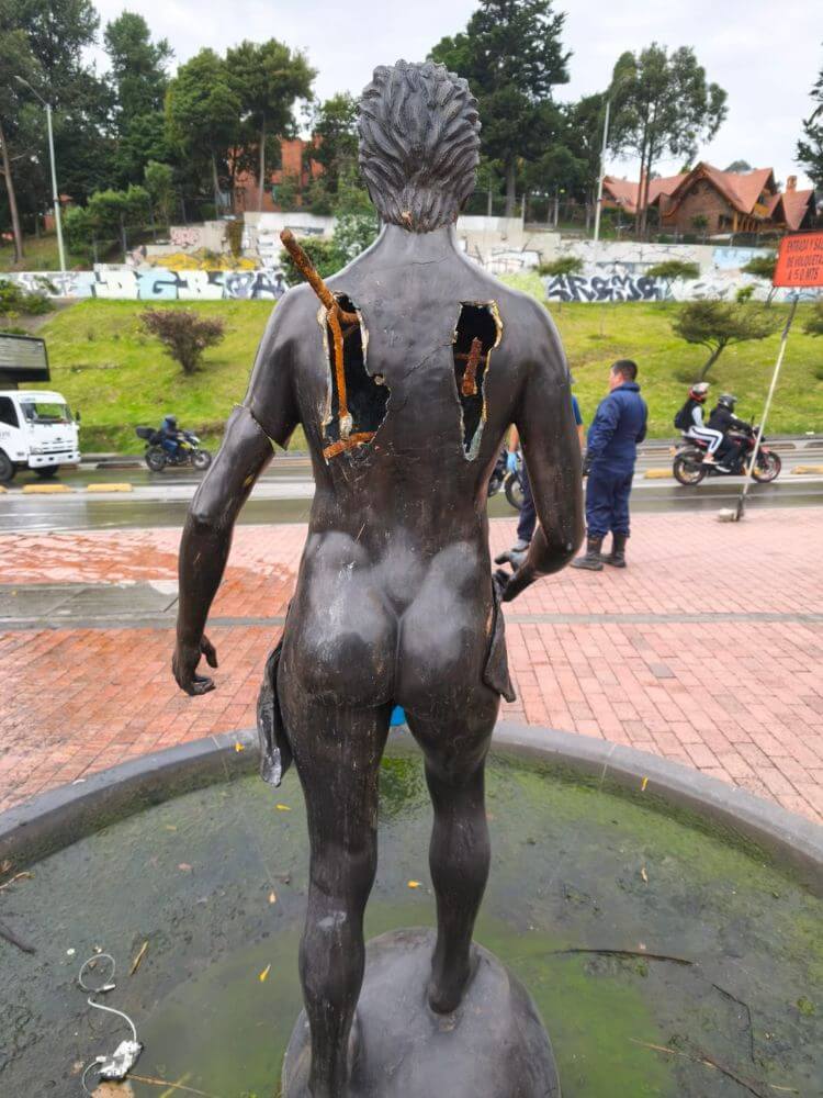 “Se evidenció que habían cortado las dos alas de la escultura central y que intentaron sustraer el brazo izquierdo, causando afectaciones importantes. Sin embargo, el sistema de seguridad implementado en 2022 evitó que este fuera retirado”, explicó Helena Fernández, integrante de la Brigada de Monumentos del IDPC.